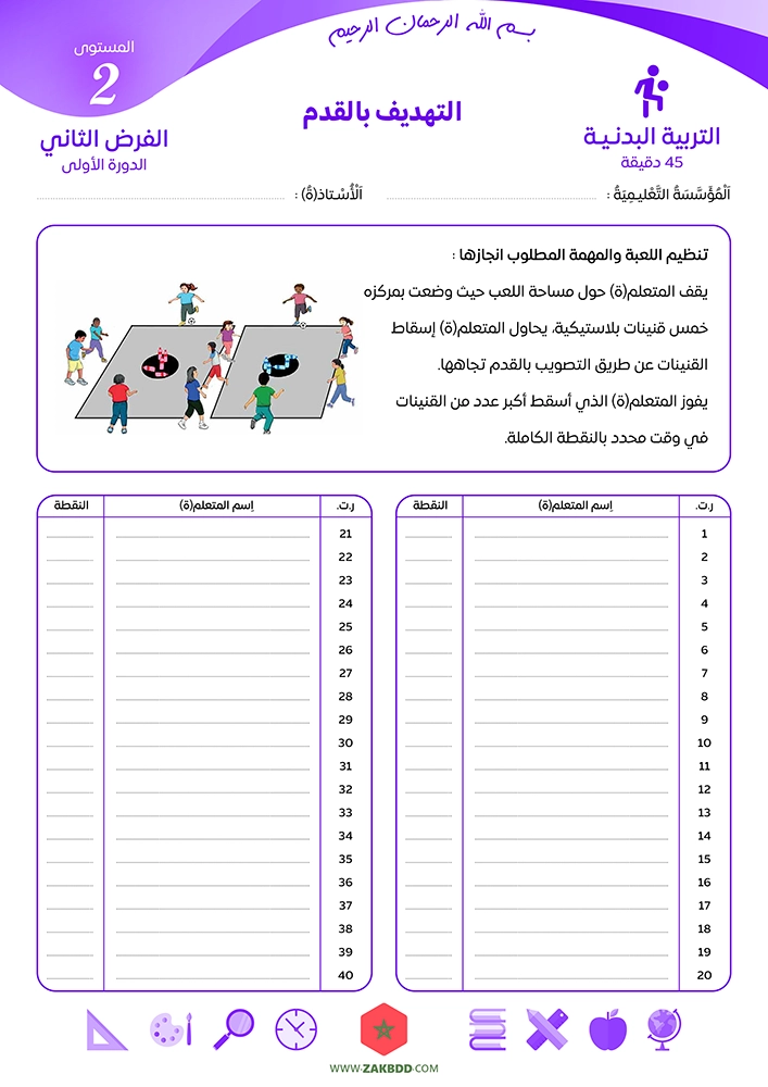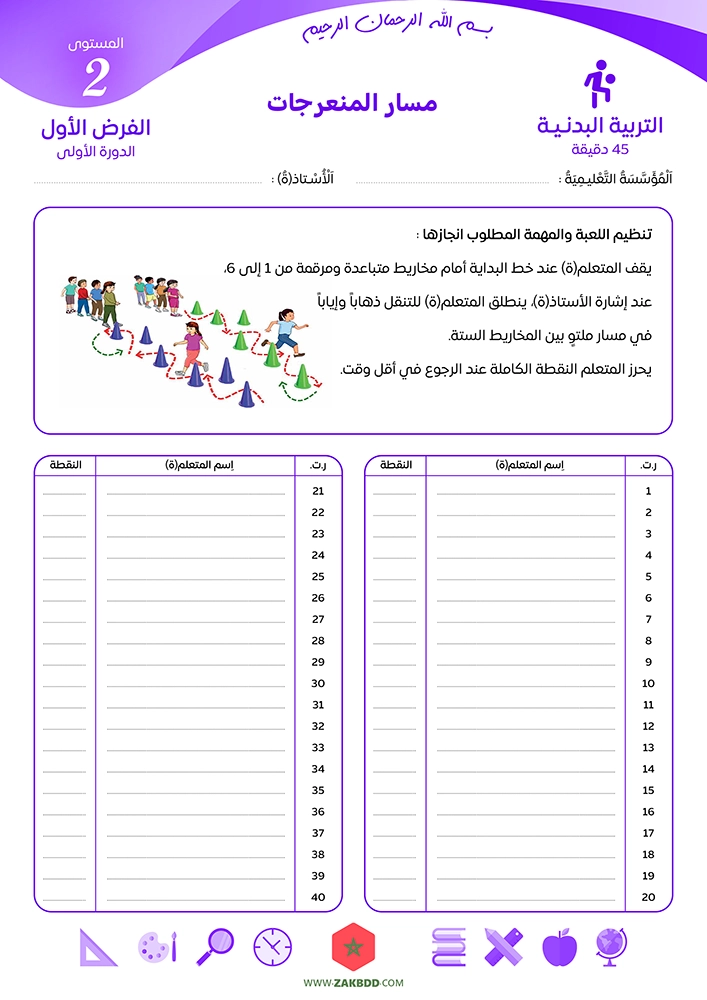حصرياً على موقع ZAKBDD ولأول مرة! نقدم لكم تصاميم جميلة ومنظمة لنماذج من فروض المراقبة المستمرة في مادة التربية البدنية للمستوى الثاني من التعليم الإبتدائي لجميع مراحل السنة الدراسية الأربعة، بحيث يتكون كل أسدوس من مرحلتين أو فرضين: