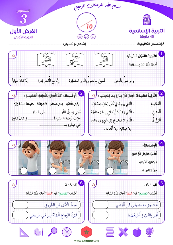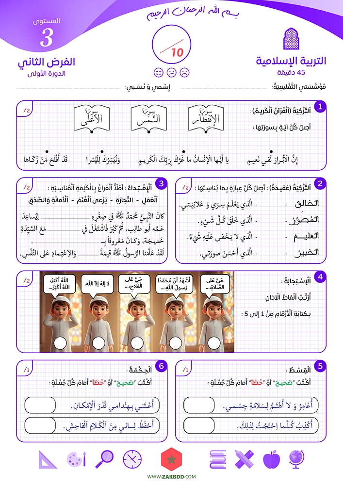 حصرياً على موقع ZAKBDD ولأول مرة! نقدم لكم تصاميم جميلة ومنظمة لنماذج من فروض المراقبة المستمرة في مادة التربية الإسلامية للمستوى الثالث من التعليم الإبتدائي لجميع مراحل السنة الدراسية الأربعة، بحيث يتكون كل أسدوس من مرحلتين أو فرضين: