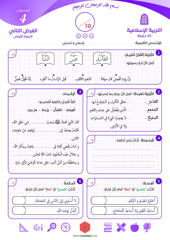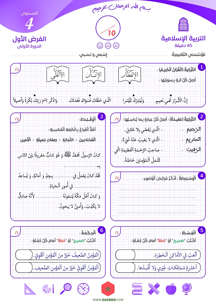 حصرياً على موقع ZAKBDD ولأول مرة! نقدم لكم تصاميم جميلة ومنظمة لنماذج من فروض المراقبة المستمرة في مادة التربية الإسلامية للمستوى الرابع من التعليم الإبتدائي لجميع مراحل السنة الدراسية الأربعة، بحيث يتكون كل أسدوس من مرحلتين أو فرضين: