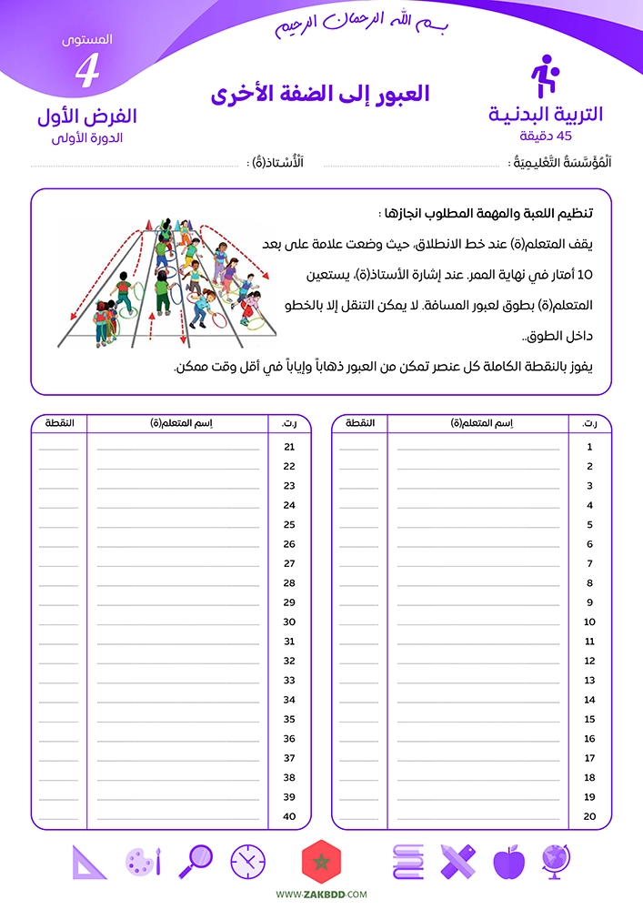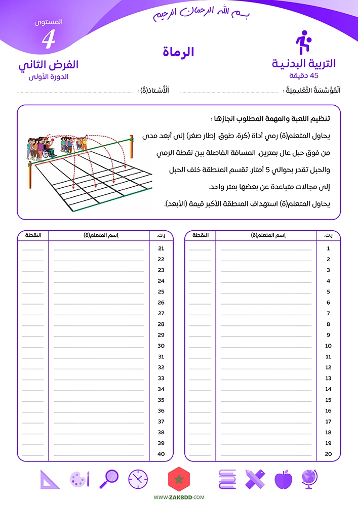 حصرياً على موقع ZAKBDD ولأول مرة! نقدم لكم تصاميم جميلة ومنظمة لنماذج من فروض المراقبة المستمرة في مادة التربية البدنية للمستوى الرابع من التعليم الإبتدائي لجميع مراحل السنة الدراسية الأربعة، بحيث يتكون كل أسدوس من مرحلتين أو فرضين: